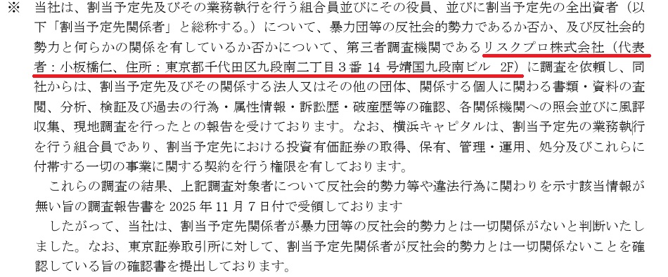 東証スタンダード上場企業(輸送用機器)の第三者割当により発行される新株予約権及び無担保転換社債型新株予約権付社債の割当先が暴力団等の反社会的勢力であるか否か、並びに割当予定先等が違法行為に関与しているか否かの第三者調査機関として、当社が採用されました。その調査報告書について、関東財務局ならびに東京証券取引所の承認を経て、有価証券届出書ならびに適時開示資料に当社の名前が掲載されています。
