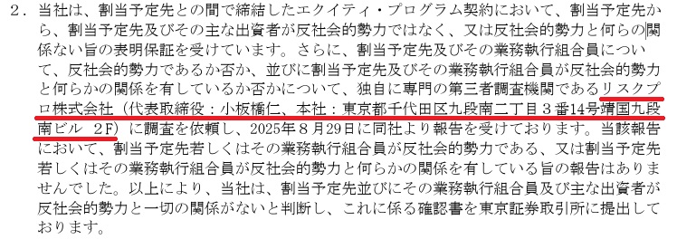 東証グロース上場企業(医薬品)の第三者割当により発行される新株式及び新株予約権の割当先が暴力団等の反社会的勢力であるか否か、並びに割当予定先等が違法行為に関与しているか否かの第三者調査機関として、当社が採用されました。その調査報告書について、関東財務局ならびに東京証券取引所の承認を経て、有価証券届出書ならびに適時開示資料に当社の名前が掲載されています。