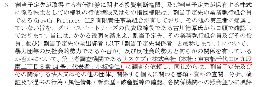 東証スタンダード上場企業(その他製造)の業務資本提携の締結先、第三者割当により発行される新株予約権及び無担保転換社債型新株予約権付社債の割当先が暴力団等の反社会的勢力であるか否か、並びに割当予定先等が違法行為に関与しているか否かの第三者調査機関として、当社が採用されました。その調査報告書について、関東財務局ならびに東京証券取引所の承認を経て、有価証券届出書ならびに適時開示資料に当社の名前が掲載されています。