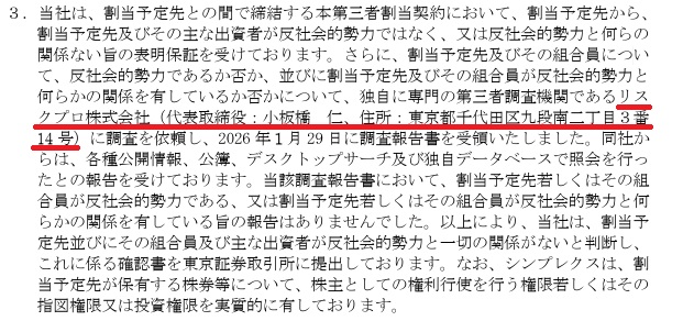 東証グロース上場企業(情報通信)の自己株式を活用した第三者割当により発行される無担保転換社債型新株予約権付社債(固定転換価額型)及び新株予約権(固定行使価額型)の割当先が暴力団等の反社会的勢力であるか否か、並びに割当予定先等が違法行為に関与しているか否かの第三者調査機関として、当社が採用されました。その調査報告書について、関東財務局ならびに東京証券取引所の承認を経て、有価証券届出書ならびに適時開示資料に当社の名前が掲載されています。