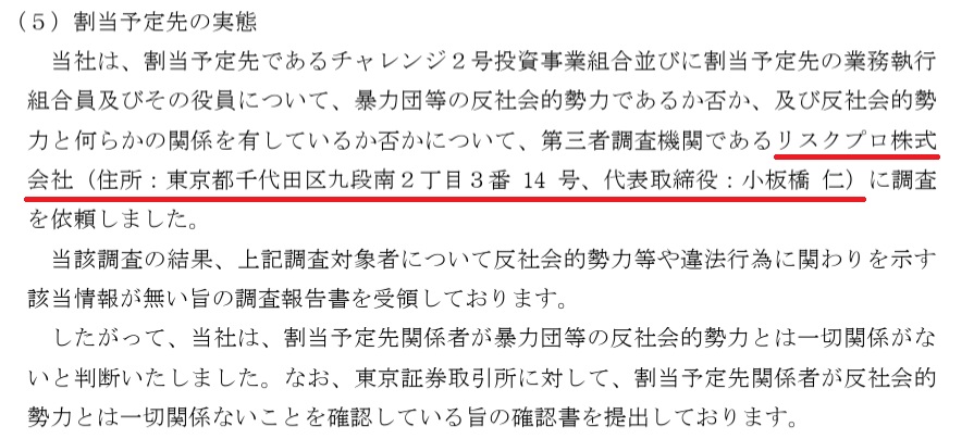 東証スタンダード上場企業(サービス)の第三者割当により発行される新株予約権(行使価額修正条項付)の割当先が暴力団等の反社会的勢力であるか否か、並びに割当予定先等が違法行為に関与しているか否かの第三者調査機関として、当社が採用されました。その調査報告書について、関東財務局ならびに東京証券取引所の承認を経て、有価証券届出書ならびに適時開示資料に当社の名前が掲載されています。