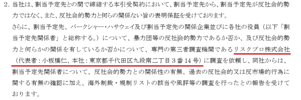 東証プライム上場企業(保険)の戦略的提携の提携先及び第三者割当による自己株式の割当予定先が暴力団等の反社会的勢力であるか否か、並びに割当予定先等が違法行為に関与しているか否かの第三者調査機関として、当社が採用されました。その調査報告書について、関東財務局ならびに東京証券取引所の承認を経て、有価証券届出書ならびに適時開示資料に当社の名前が掲載されています。