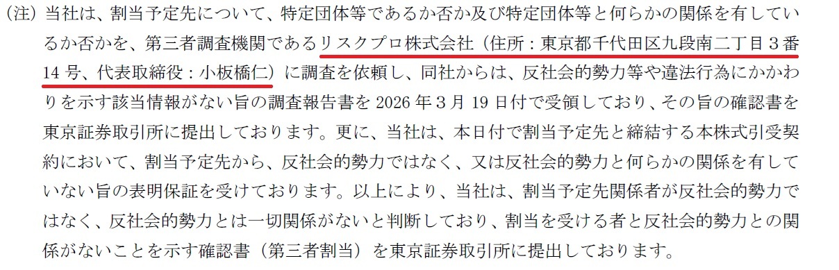 東証プライム上場企業(ガラス・土石製品)の第三者割当により発行される新株式の割当先が暴力団等の反社会的勢力であるか否か、並びに割当予定先等が違法行為に関与しているか否かの第三者調査機関として、当社が採用されました。その調査報告書について、関東財務局ならびに東京証券取引所の承認を経て、有価証券届出書ならびに適時開示資料に当社の名前が掲載されています。