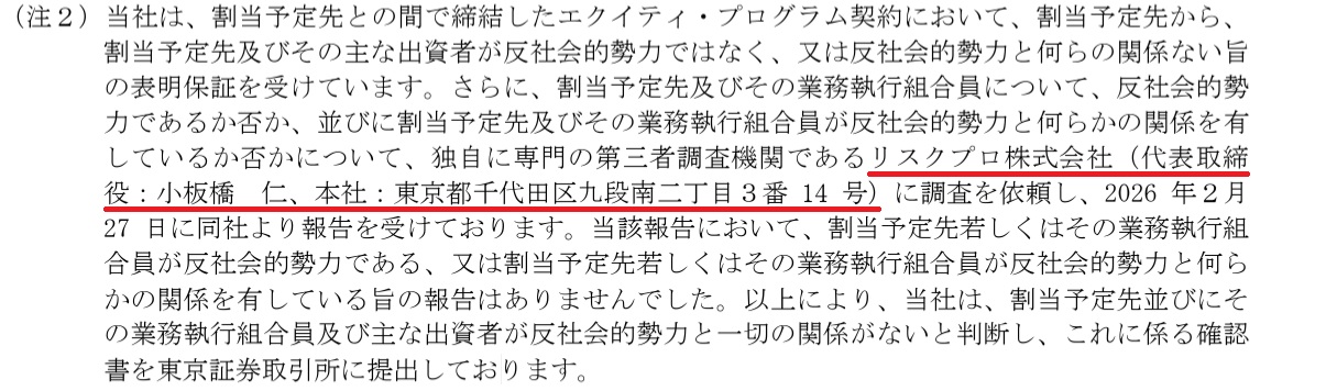 東証グロース上場企業(医薬品)の第三者割当により発行される新株式及び新株予約権の割当先が暴力団等の反社会的勢力であるか否か、並びに割当予定先等が違法行為に関与しているか否かの第三者調査機関として、当社が採用されました。その調査報告書について、関東財務局ならびに東京証券取引所の承認を経て、有価証券届出書ならびに適時開示資料に当社の名前が掲載されています。