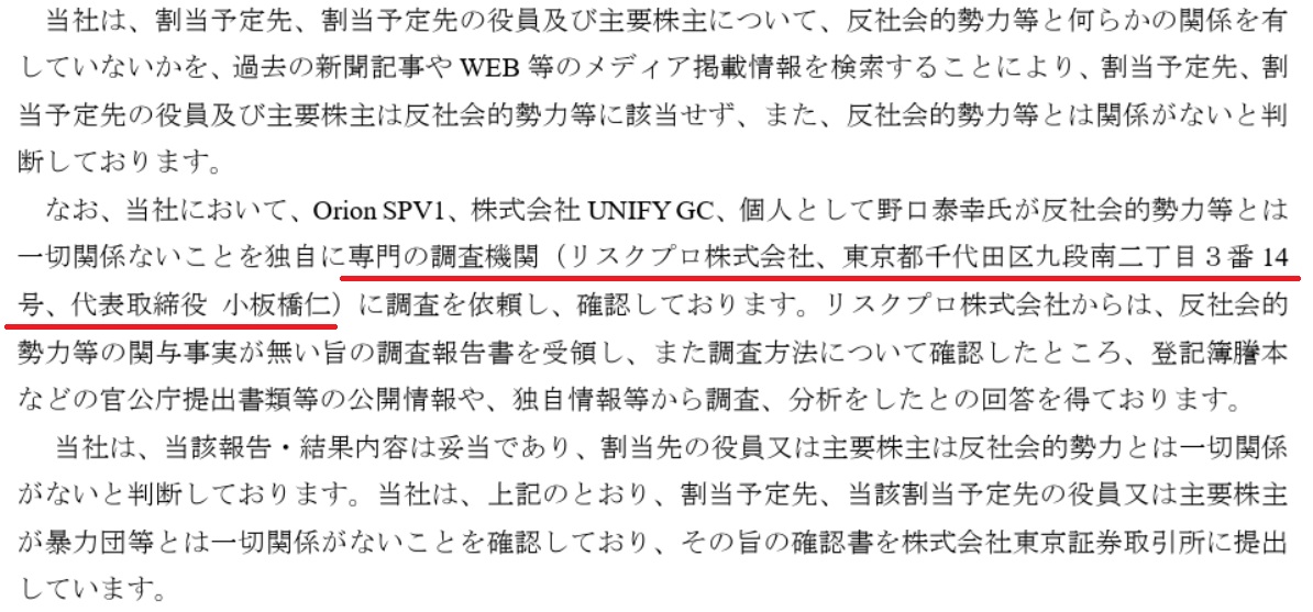 東証スタンダード上場企業(サービス)の第三者割当による新株予約権の割当先が暴力団等の反社会的勢力であるか否か、並びに割当予定先等が違法行為に関与しているか否かの第三者調査機関として、当社が採用されました。その調査報告書について、関東財務局ならびに東京証券取引所の承認を経て、有価証券届出書ならびに適時開示資料に当社の名前が掲載されています。